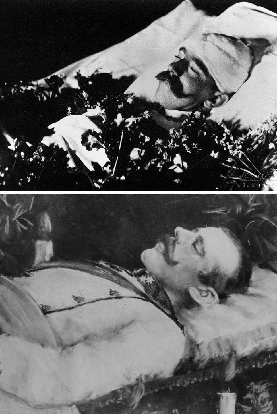 Top: Rudolf at the private lying-in-state with his head wrapped in bandages.