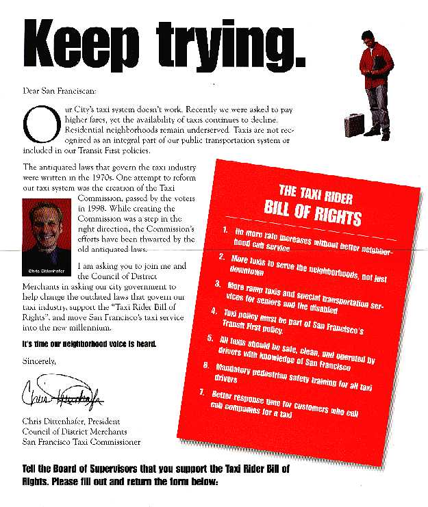 The taxi mailer asks recipients to call members of the Board of Supervisors to support enactment of a seven-point ``taxi rider bill of rights.''