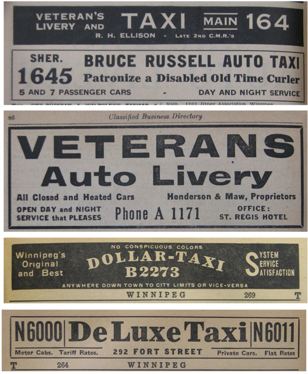 Telephone book ads from the 1920s. The Veterans ad, top, appeals to customer patriotism with proprietor R.H. Ellison citing his service with the second battalion, Canadian Mounted Rifles. Bruce Russell's frank appeal to charity was unique (he dropped it in later ads). The third ad makes closed and heated sedans a selling point aimed at taxi customers tired of chilly rides in open touring cars.