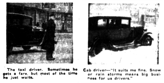 Two 1935 photographs from C.P. Detloff's "Meandering Candid Camera" series. Left: "The candid camera scours Winnipeg to illustrate a single word – Waiting." Right: "Minute interviews with various persons regarding Tuesday [March 5, 1935], the day of the big snow. Question – 'Do you enjoy snow storms?'"