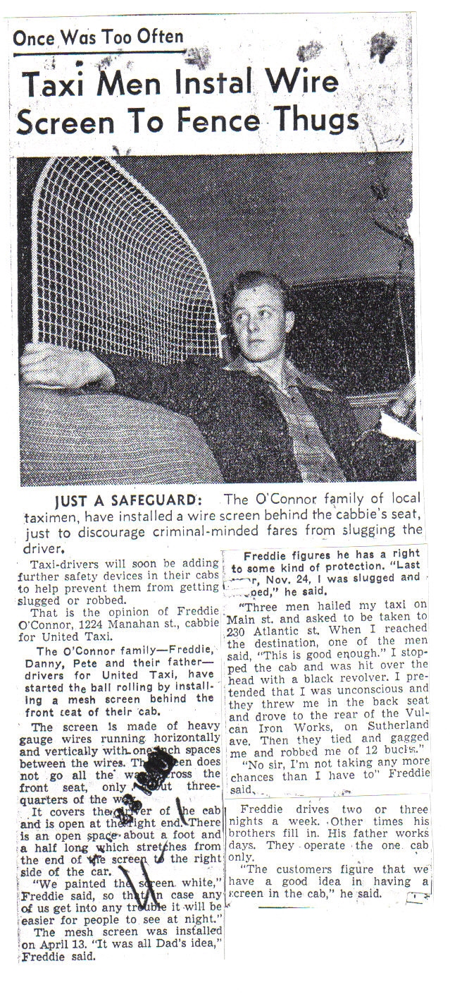 Above:April, 1946 – the O'Connor family installed a protective wire screen in their cab. Below: April, 1946 – John McConkey of Adolph's Taxi showed off a plexiglass shield installed by a local manufacturer.